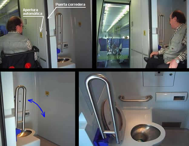 Galería de imágenes educativas: plaza adaptada y aseo para personas con silla de ruedas en los ferrocarriles y sistema elevador para acceso al tren.